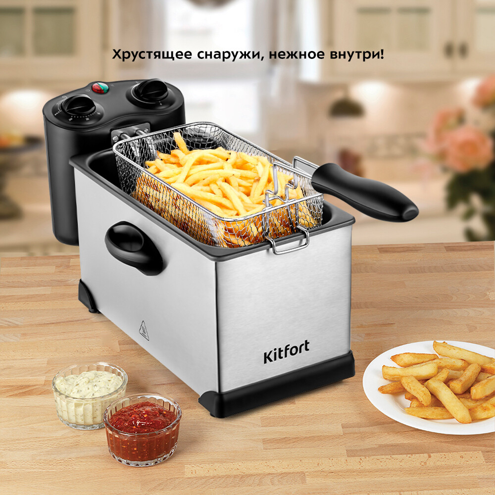 Продукты во фритюрнице Kitfort КТ-4052 готовятся быстрее, чем на сковороде из-за короткого воздействия высокой температуры со всех сторон.