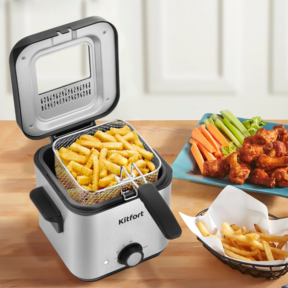 Фритюрница КТ-4075 предназначена для приготовления продуктов в слое горячего масла. С помощью прибора возможно приготовить картофель фри, пончики, куриные крылышки в домашних условиях. Также можно жарить овощи, рыбу, мясо, морепродукты в кляре и без. Устанавливайте температуру от 130 до 190°C. На передней стороне прибора расположены регулятор температуры и индикатор нагрева. Ручкой регулятора выбирается температура от 130 до 190°C. Индикатор нагрева горит, когда происходит нагрев фритюрницы. Крышка прибора съемная, что упрощает уход за фритюрницей. На крышке расположены отверстия для выхода пара с фильтром. Благодаря фильтру брызги масла не проходят через отверстия. В крышке фритюрницы имеется смотровое окно, через которое можно легко следить за готовностью блюда, не поднимая крышку. Фритюрница отличается компактностью. Две ручки по бокам прибора позволяют легко переносить фритюрницу. Для удобства хранения корзина для жарки имеет съемную ручку: в разобранном виде корзина и ручка помещаются внутрь фритюрницы. У фритюрницы есть защита от перегрева. Установленный в прибор термостат отключит нагрев прибора, если температура превысит допустимое значение. Небольшой объем чаши позволяет экономно расходовать масло.