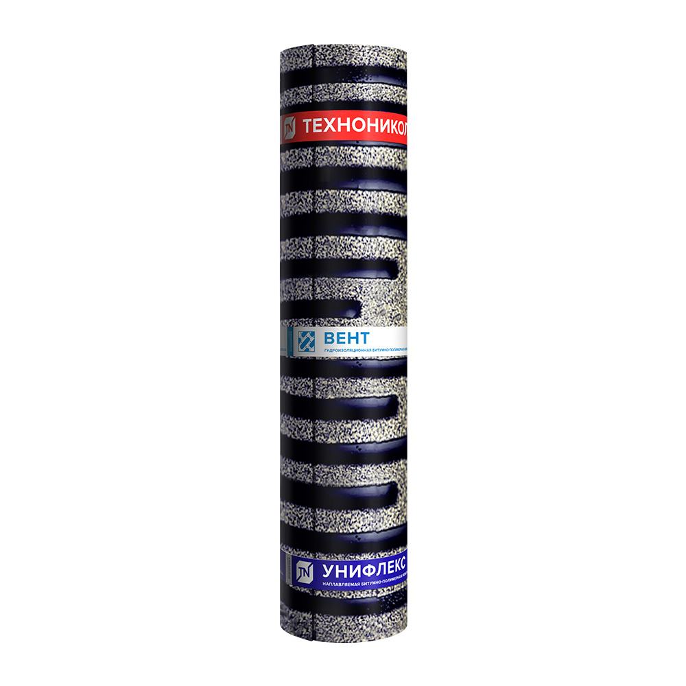 Применяется для устройства нижних слоев многослойной гидроизоляции на крыше зданий и сооружений. Применяется для устройства «дышащих» кровель, с полосовой приклейкой к основанию, решает проблему вздутий гидроизоляции. Унифлекс ВЕНТ – материал рулонный гидроизоляционный наплавляемый битумно-полимерный. Унифлекс ВЕНТ получают путем двустороннего нанесения на полиэфирную основу битумно-полимерного вяжущего, состоящего из битума, СБС (стирол-бутадиен-стирол) полимерного модификатора и минерального наполнителя (тальк, доломит и др.) В качестве защитного слоя используют полимерное покрытие сверху и вентилируемую поверхность снизу. Вентилируемая поверхность имеет полоски из битумно-полимерного вяжущего, пространство между которыми заполнено мелкофракционным песком и вся поверхность снизу.