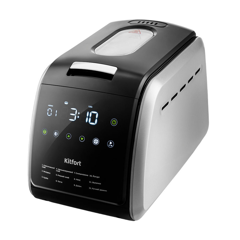 Хлебопечь КТ-305 позволяет готовить различные виды хлеба, джем и десерты, йогурт, а также различные виды теста. Корпус прибора сделан из сочетания пластика и нержавеющей стали. В верхней крышке есть прозрачное окно, через которое можно наблюдать за процессом приготовления хлеба. С помощью 12 автоматических программ вы легко приготовите вкусную домашнюю выпечку, ржаной хлеб, сдобу, йогурт, джем или десерты, замесите тесто на пироги или пиццу. Вы можете начать приготовление в более позднее время, используя функцию отложенного старта, или наоборот, воспользоваться программой ускоренной выпечки. Хлебопечь снабжена функцией выбора веса готового продукта и цвета корочки в соответствии с вашими вкусовыми предпочтениями. Во время приготовления вы можете добавить в тесто дополнительные ингредиенты, например, цукаты или орехи. О том, что ингредиенты можно добавить сообщит звуковой сигнал и специальный значок на дисплее.