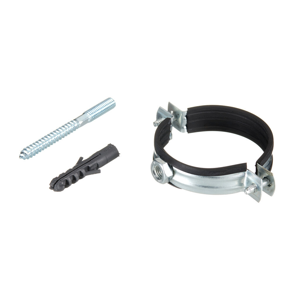 Состав: хомут, шпилька М10 – оцинкованная сталь, уплотнитель – резина, дюбель 10х50 мм – полипропилен.
