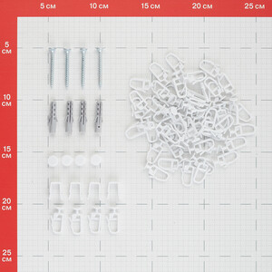 Шина – 1 шт., Стопор для пластмассовой шины – 4 шт., Заглушка для пластмассовых шин – 2 шт., Крючок для пластмассовой шины – 56 шт., Комплект крепежа – 1шт., Инструкция – 1шт.