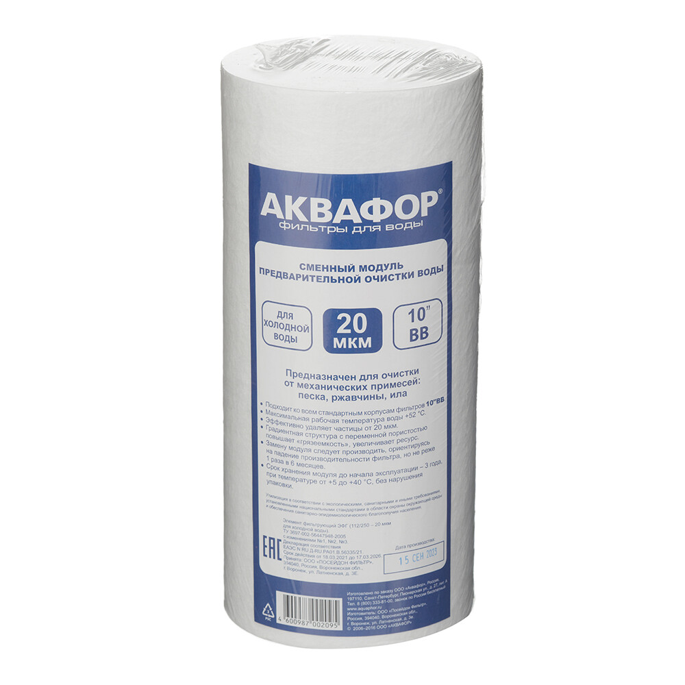 Предназначен для очистки воды. Устанавливается в корпус водоочистителя для холодной воды Аквафор и другие водоочистители со стандартным картриджем BigBlue 254 мм. (10»). Удаляет мелкие (до 20 мкм.) механические примеси, такие как грязь, песок и ржавчина, снижает мутность воды.