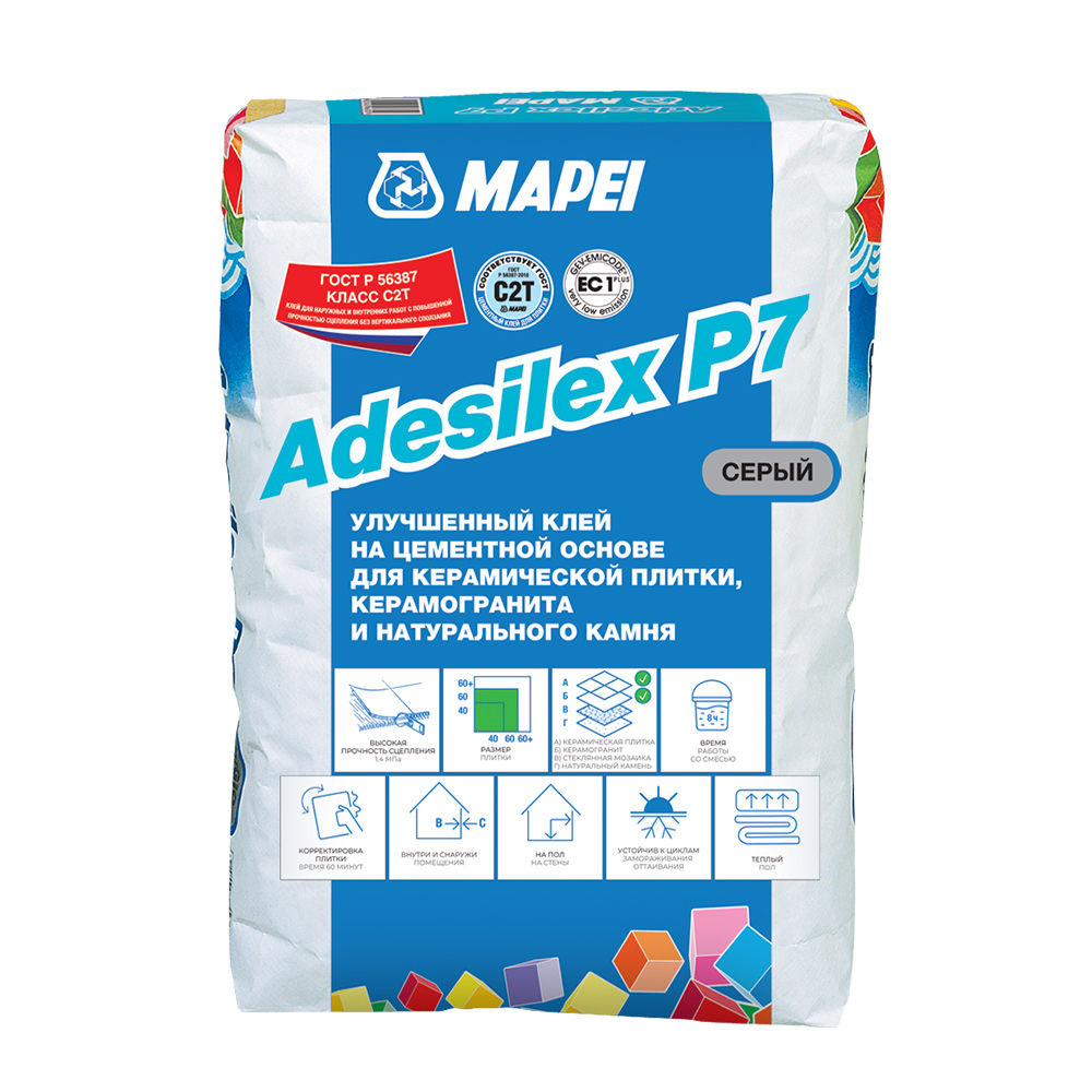 Adesilex P7 предназначен для укладки керамической плитки и мозаики, керамогранита на пол, стены и потолок внутри и вне помещений. Подходит также для точечного приклеивания таких изоляционных материалов как пенополистирол и минеральная вата, цементно-стружечной плиты, звукоизоляционные панели и пр.