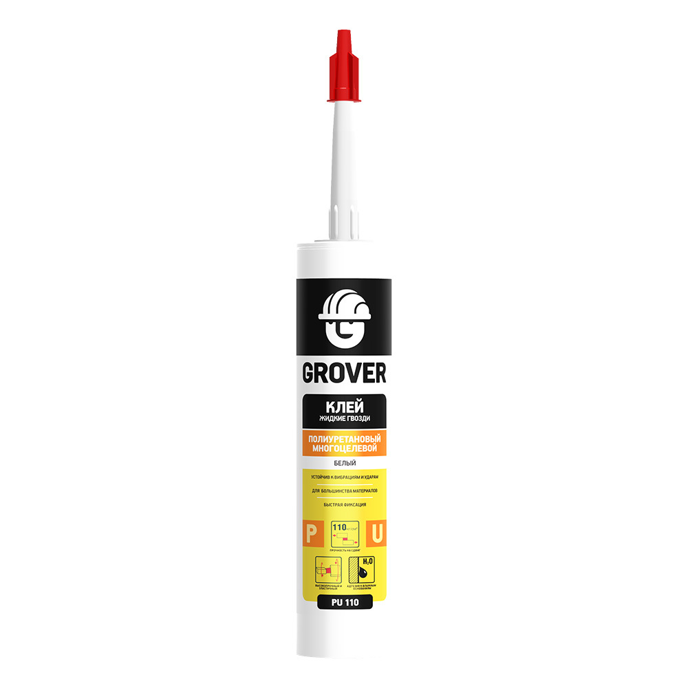 Клей Grover PU110 на основе полиуретана обеспечивает высокую прочность клеевого шва и устойчивость к высоким динамическим нагрузкам (вибрациям и ударам), а также быструю фиксацию склеиваемых элементов. Прочность на сдвиг 110 кг/см2. При отвердении слегка пенится, заполняя поры склеиваемых поверхностей, тем самым увеличивая прочность склеивания. Пригоден для использования в тяжелых условиях благодаря высокой стойкости к воздействию влаги, атмосферных факторов и старению. Благодаря эластичности, может применяться в качестве герметика для устройства деформационных и компенсационных швов.