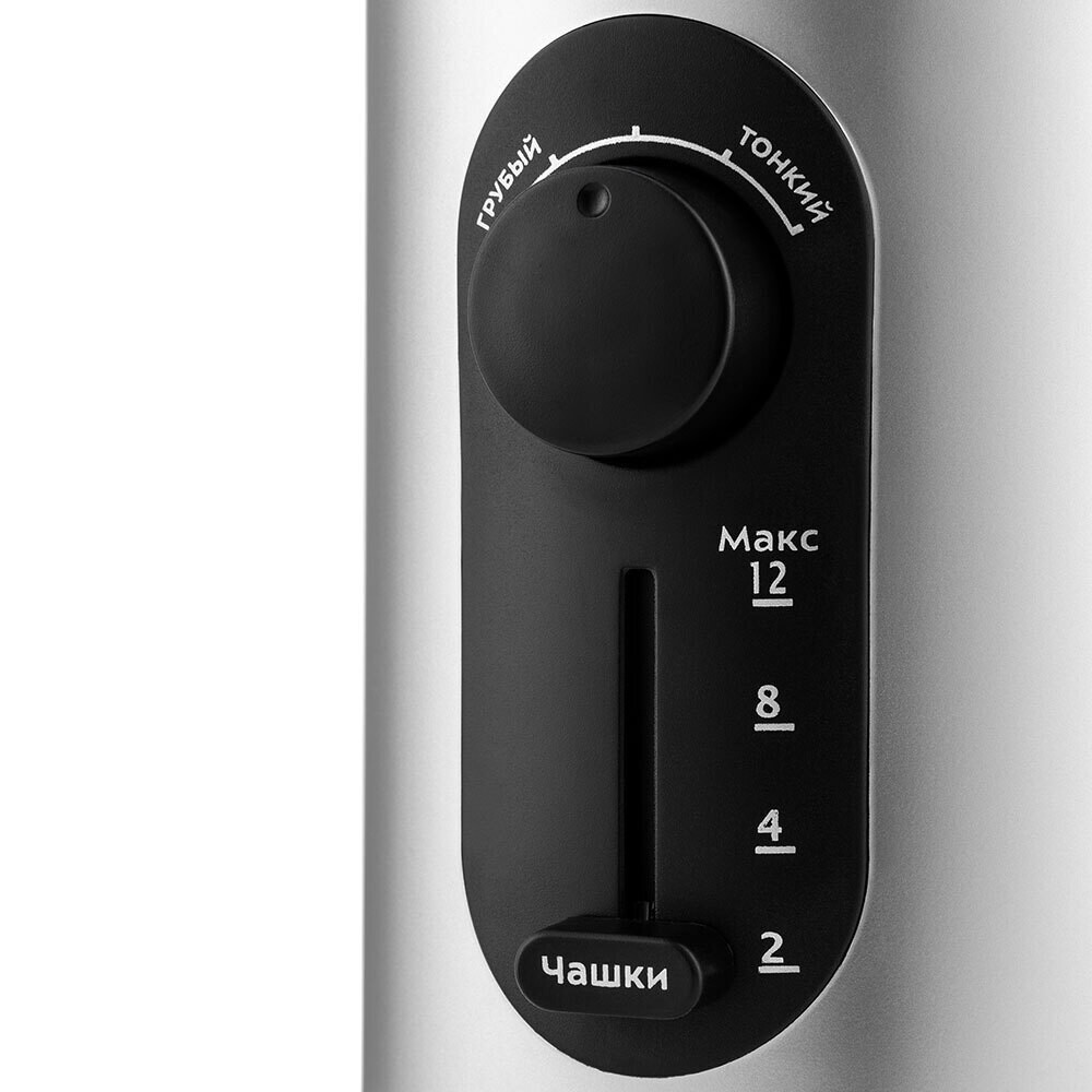 Прибор оснащен регуляторами степени помола и количества чашек.