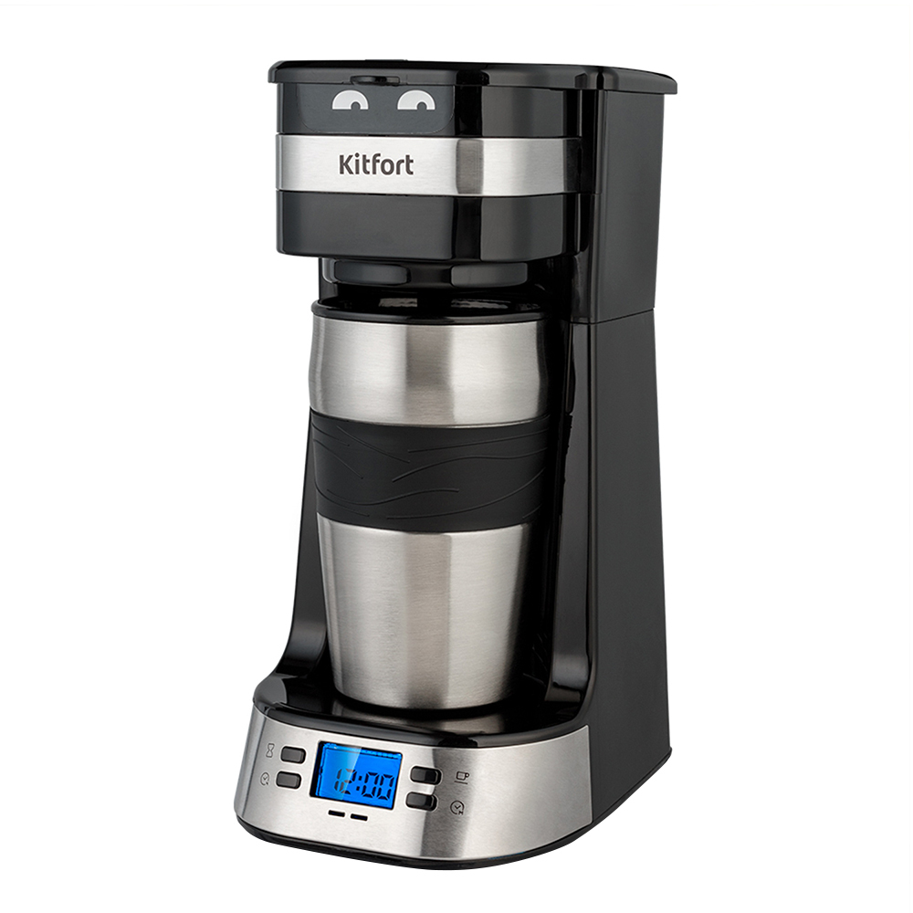 Капельная кофеварка Kitfort КТ-795 готовит ароматный черный кофе из молотого кофе одним нажатием кнопки. Компактная кофеварка КТ-795 экономит место на кухне и рассчитана на приготовление кофе за 1 раз на 1-3 чашки. Многоразовый фильтр вмещает 15 гр кофе. Кофеварка КТ-795 оборудована дисплеем, который показывает текущее время и заданные настройки. Данная кофеварка имеет функцию отложенного старта. Также кофеварка оснащена прорезиненными ножками, которые предотвращают скольжение по столу. Термокружка выполнена из пластика и нержавеющей стали с силиконовой вставкой. В кофеварке вода доводится до температуры 80-90°С, после чего медленно поступает в фильтр с молотым кофе. Многоразовый фильтр позволяет заваривать кофе неограниченное количество раз. В резервуаре для воды есть специальные отметки 240, 300 и 420 мл.