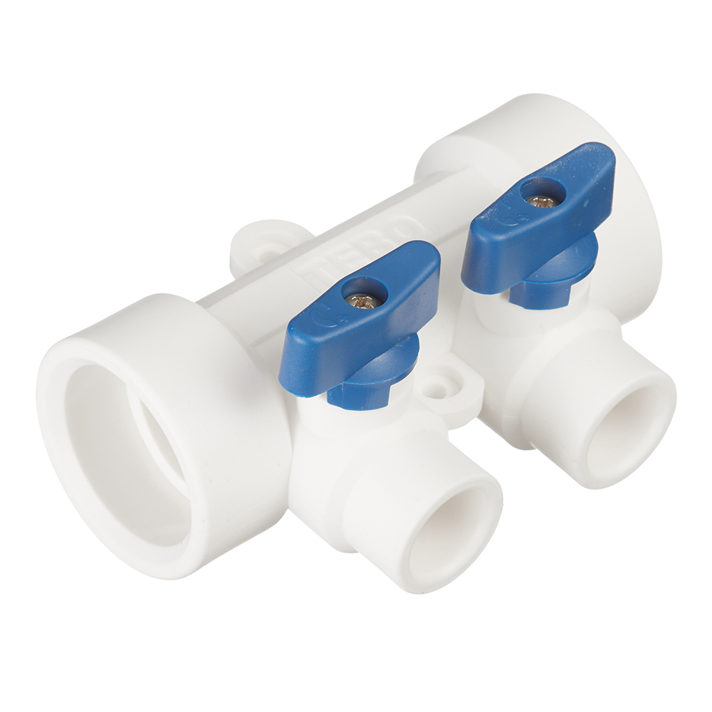 Предназначен для распределения потока жидкости по контурам отопления или водоснабжения. Позволяет сразу вварить трубу из PP-R.