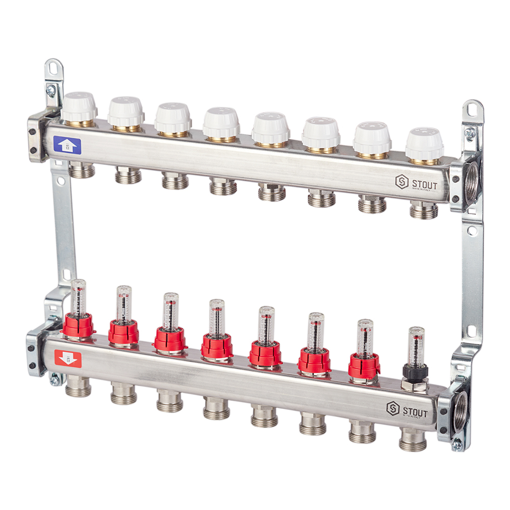 Коллекторная группа с расходомерами нержавеющая сталь Stout 1 ВР(г) х 8 выходов 3/4 НР(ш) ЕК х 1 ВР(г)