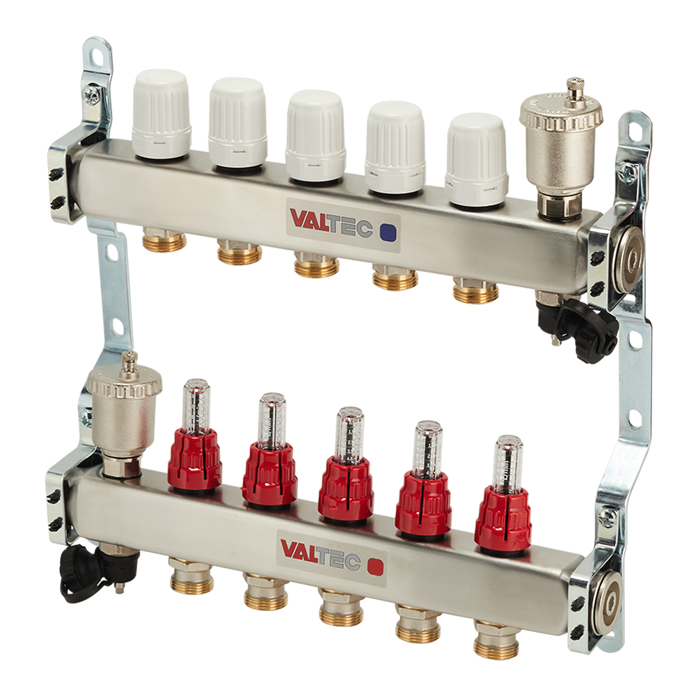 Комплектация: Коллектор 1″ внутр(г) х 5 отводов 3/4″ нар(ш) х 1″ внутр(г) с термостатическими клапанами, коллектор 1″ внутр(г) х 5 отводов 3/4″ нар(ш) х 1″ внутр(г) с расходомерами, воздухоотводчик – 2 шт., отсекающий клапан воздухоотводчика – 2 шт., дренажный поворотный кран – 2 шт., кронштейн для монтажа коллекторов — 2 шт.
