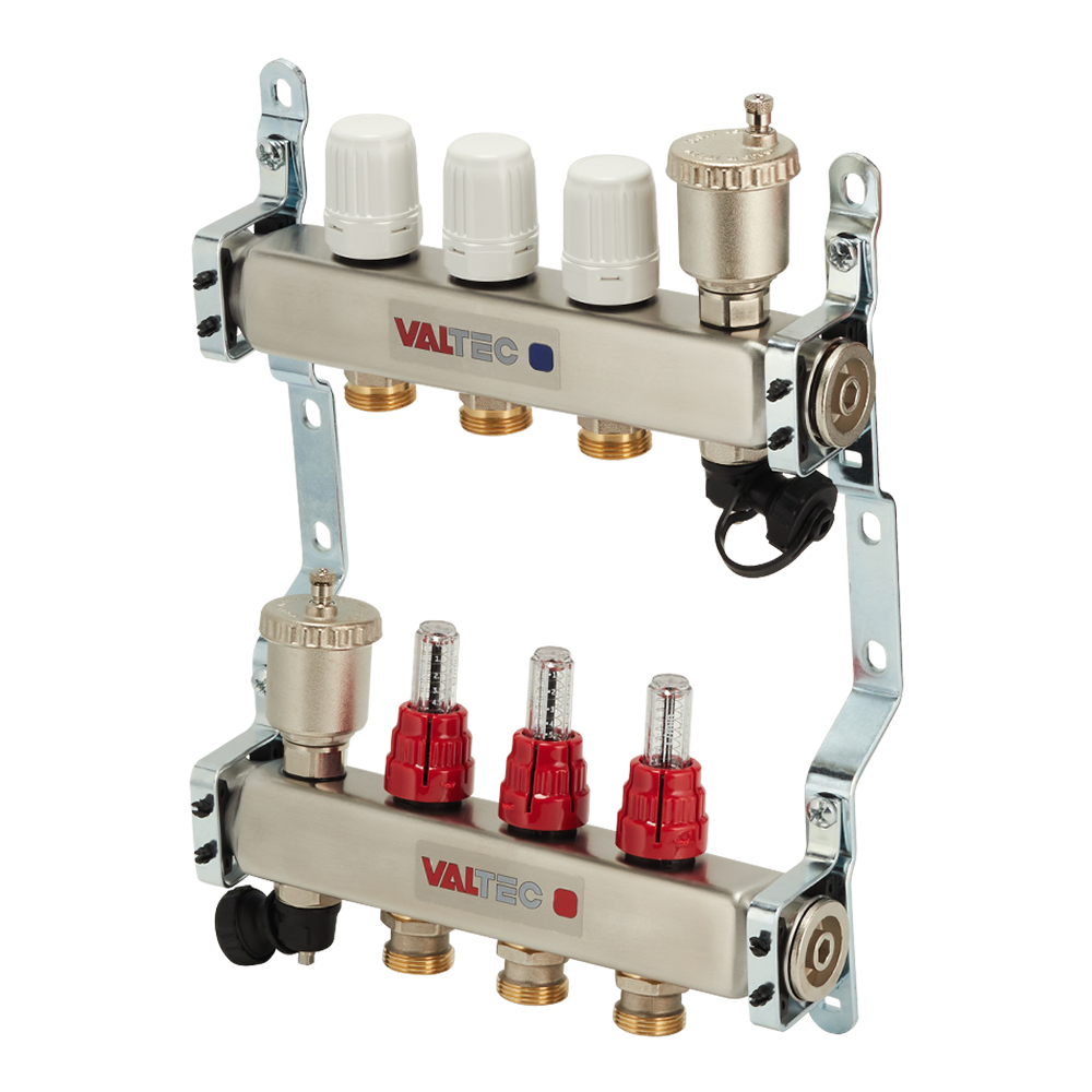 Каждый коллектор имеет автоматический воздухоотводчик и дренажный клапан. Присоединение циркуляционных петель осуществляется с помощью фитингов стандарта «евроконус».