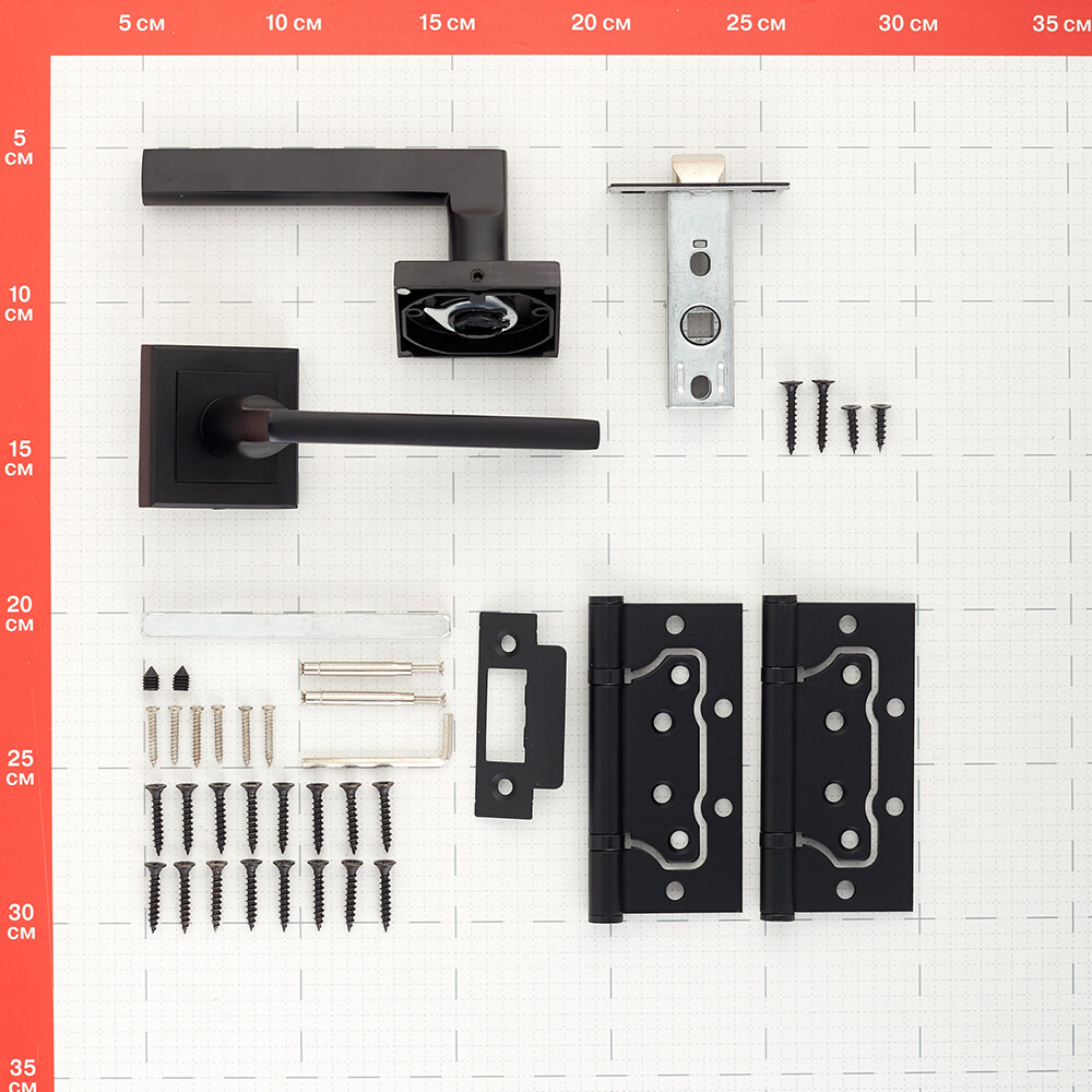 ручка на розетке – 2 шт, петля накладная универсальная 100х75х2,5 мм – 2 шт, стяжка (стягивающая втулка) – 2 шт, защелка межкомнатная – 1 шт, стержень квадратный соединительный 8х8 мм – 1 шт, шестигранный ключ – 2 шт, комплект крепежа, инструкция.