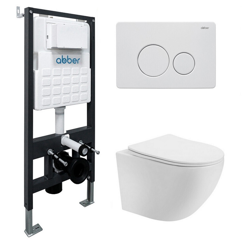 Комплект Abber 3 в 1. В комплекте есть все необходимое для быстрого монтажа. Состоит из подвесного керамического унитаза со смывом торнадо, сиденья для унитаза из дюропласта с микролифтом, инсталляции AC0105, кнопки смыва из нержавеющей стали.