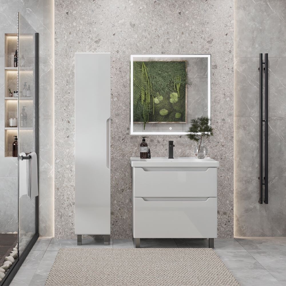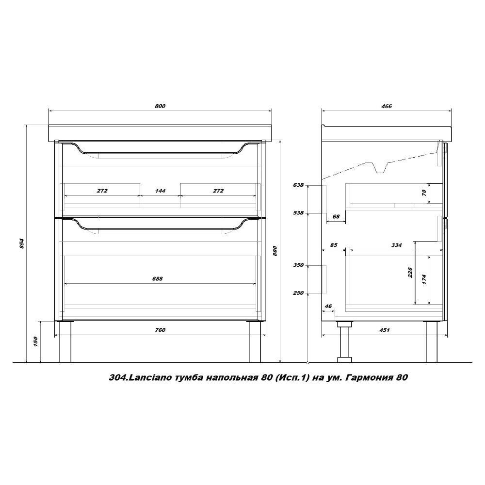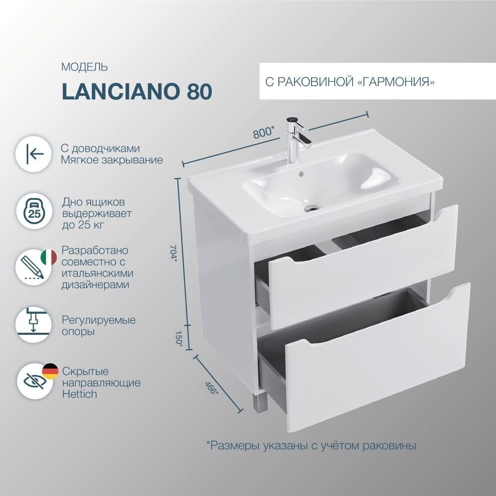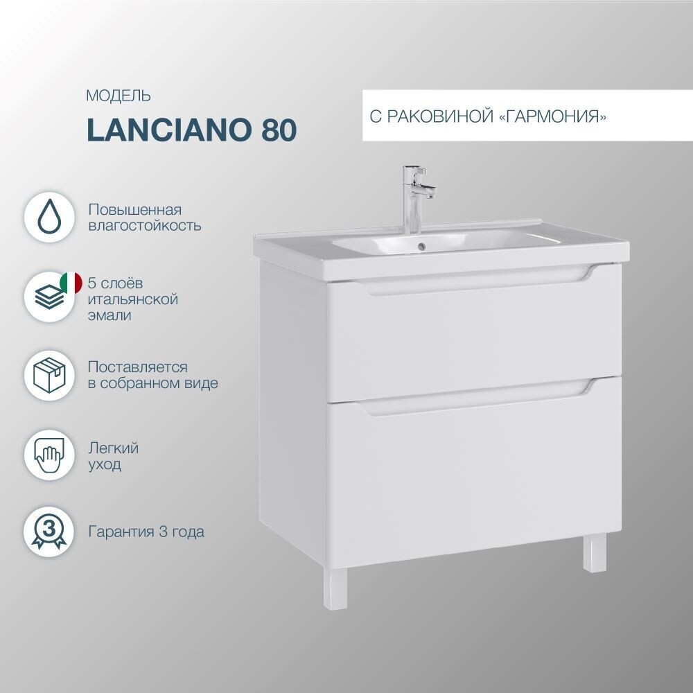 Тумба напольная SanStar Lanciano 80 с раковиной Гармония 80 для ванной комнаты выполнена в современном стиле. Для изготовления корпуса используется влагостойкий ЛДСП , фасад изготавливается из МДФ. Окрашивание изделия производится в пять этапов с применением итальянской эмали, глянец. Фурнитура — хром. Два выдвижных ящика с направляющими скрытого монтажа и доводчиками Hettich. В набор входит раковина Гармония 80, выполненная из санфаянса.