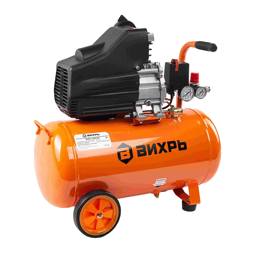 Компрессор Вихрь КМП-300/50 74/3/4 представляет собой наиболее мощное устройство в серии. Прямая передача без ремня снижает уровень шума. Небольшие размеры и наличие тяговой рукоятки вместе с колесами упрощает транспортировку изделия. Конструкция устойчива за счет колес и опор под ресивером. Емкость достаточна, чтобы в течение некоторого времени с момента выключения двигателя можно было подавать сжатый воздух. У компрессора «Вихрь» КМП-300/50 74/3/4 тип соединения — рапид (EURO).
