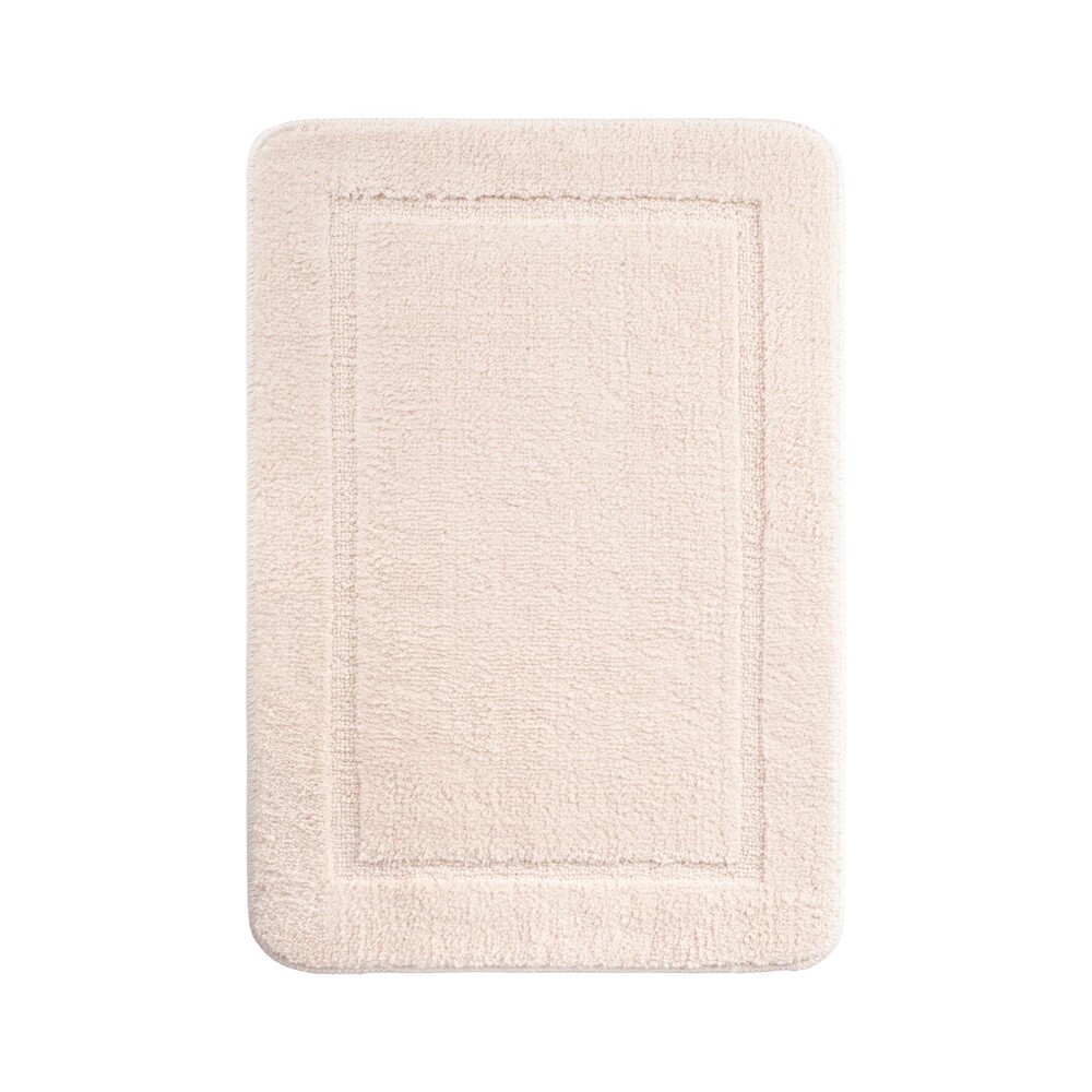 Мягкий коврик для ванной бежевого цвета с плотным, невысоким ворсом (1 см), приятный на ощупь. Ворс из микрофибры отлично держит форму, легко чистится и быстро сохнет.