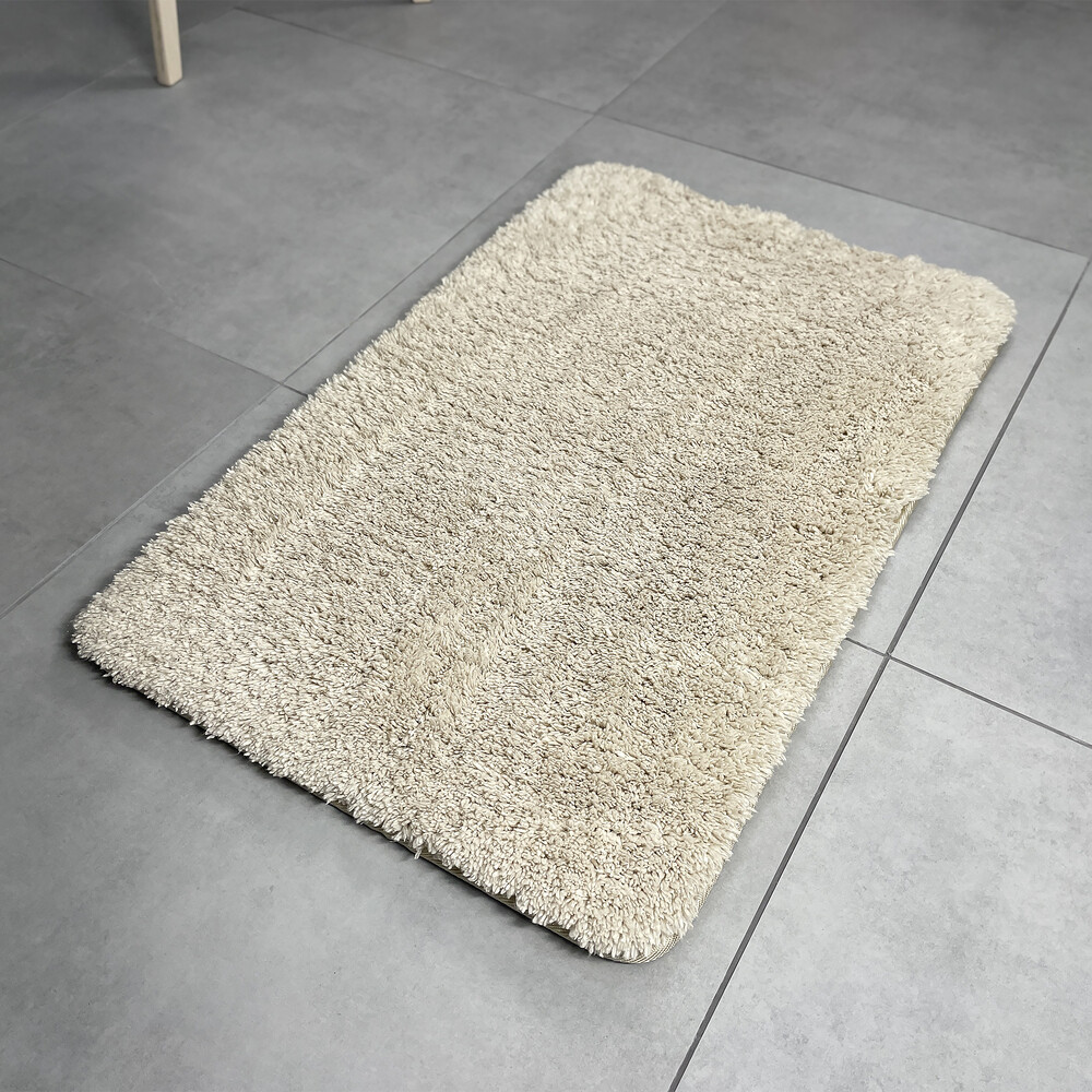 Коврик из микрофибры сочетает в себе практичность и качество исполнения. Его кремовый цвет подходит для большинства интерьеров. Коврик очень пушистый и мягкий. Он имеет прямоугольную форму, антискользящую основу ПВХ и устойчивость к износу. Также, может применяться в помещениях с подогреваемыми полами. Подходит как для ручной, так и для машинной стирки при температуре 30°C без отжима.