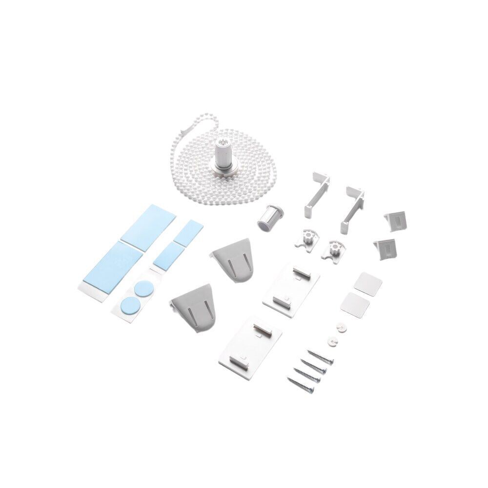 Комплектация: Механизм с цепочкой — 1 шт., упорный валик — 1 шт., боковые кронштейны — 2 шт., навесные кронштейны — 2 шт., монтажные площадки для крепления на «глухую» створку — 2 шт., двусторонний скотч, фиксатор — 2 шт., ограничитель размотки ткани — 2 шт., комплект шурупов и дюбелей — 1 шт., инструкция — 1 шт.