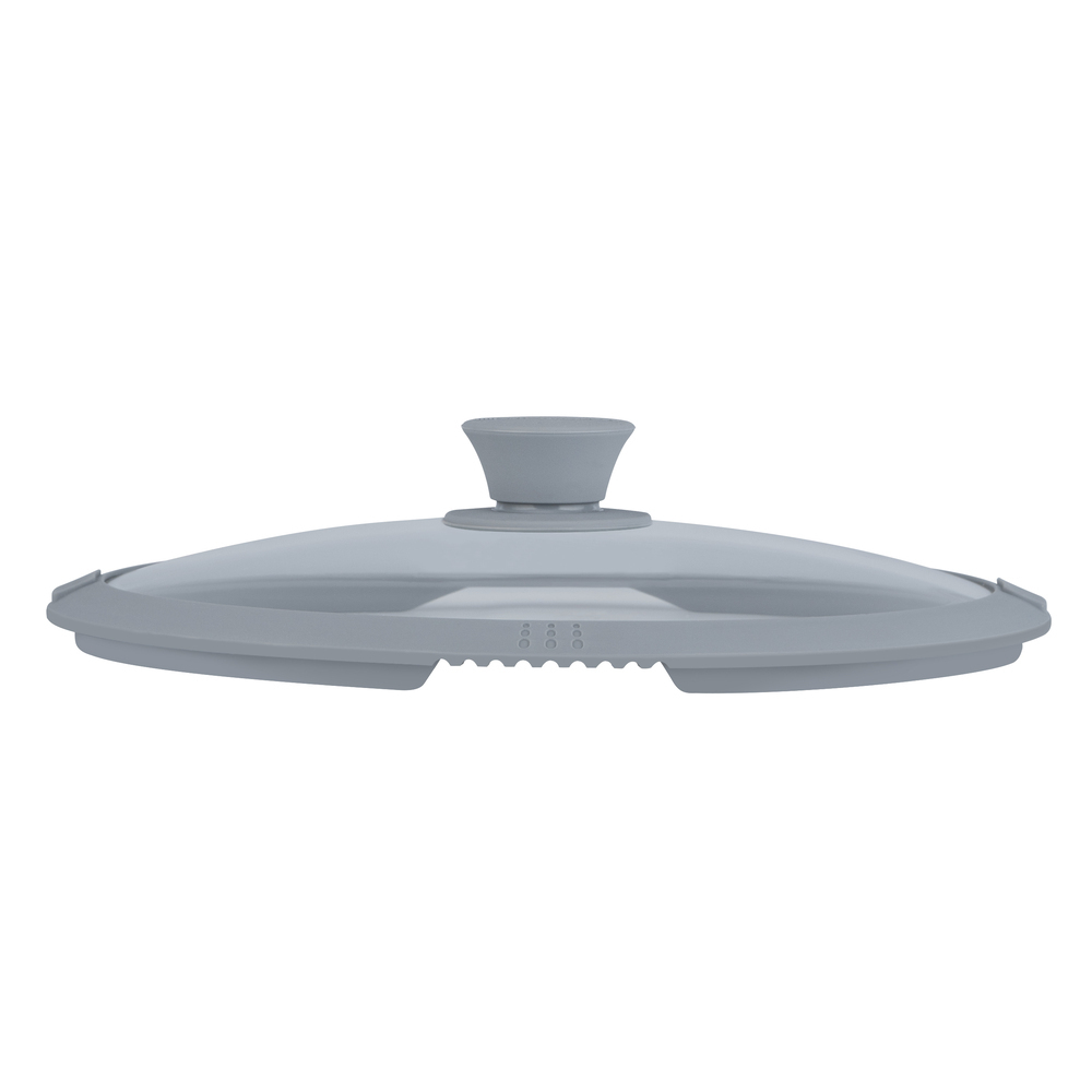 Крышка стеклянная с силиконовым ободом, два отверстия для слива, серый цвет. Подходит для посуды диаметром 26 см. Можно мыть в посудомоечной машине. Можно использовать в духовке (рекомендуемое время использования не более 1 часа при температуре не выше 200 °C). Безопасность контакта с пищевыми продуктами подтверждена международным сертификатом FDA.