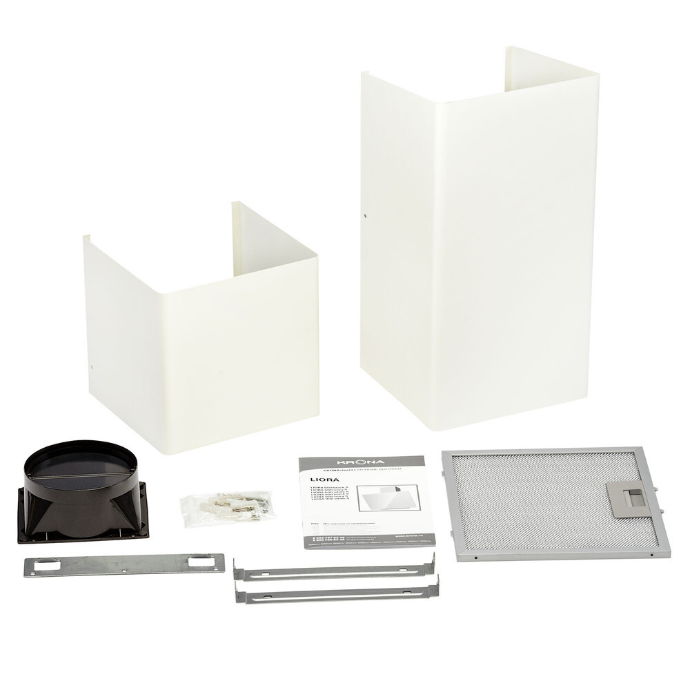 Вытяжка, алюминиевый жироулавливающий фильтр, декоративный кожух – 2 шт., антивозвратный клапан, гарантийный талон. Обращаем внимание, угольный фильтр не входит в комплектацию к вытяжке, приобретается отдельно.