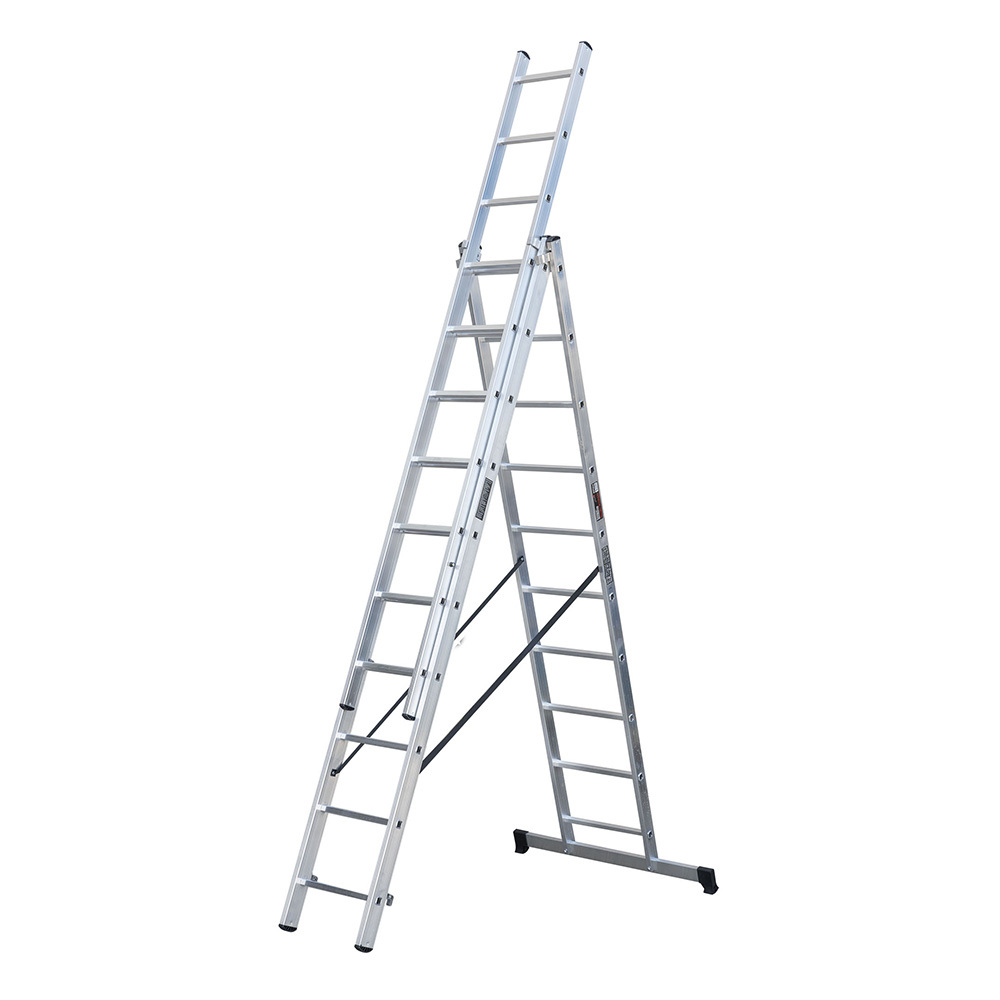 Предназначена для бытового использования. Лестница 3-секционная, в каждой секции 10 ступеней. Может быть использована как приставная лестница, раздвижная лестница, стремянка, стремянка с выдвижной секцией. Имеет дополнительную функцию «лестничный марш» (установка на разноуровневой поверхности). Стойки и перекладины изготовлены из алюминиевого профиля. Рифленые перекладины имеют размер 23х23 мм для надежного сцепления. Вальцовочное крепление перекладин по прочности не уступает сварке, а широкая опорная траверса стабилизирует конструкцию. Лестница оснащена двумя зацепами и автоматическим фиксатором секции на нужном шаге. Кронштейны соединяют и направляют секции, а алюминиевая стяжка создает жесткую конструкцию и фиксирует рабочее положение. Страховочные погодоустойчивые ремни на заклепках с увеличенной шляпкой создают жесткую конструкцию, не гниют и не выгорают. Башмаки траверсы из прочного пластика не скользят и не повреждают поверхность. Лестница компактно складывается для хранения и транспортировки, в сложенном состоянии занимает мало места.