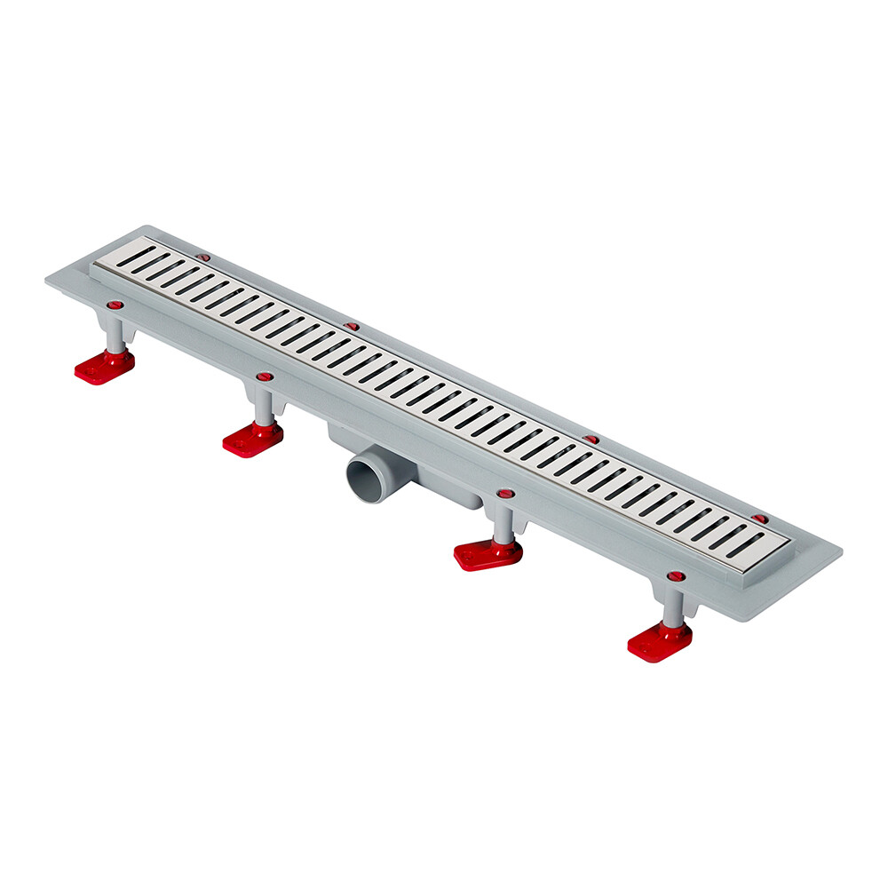Имеет вытянутую прямоугольную форму, также называют дренажным каналом или душевым лотком. Сверху конструкция трапа закрывается декоративной решеткой из нержавеющей стали. Это идеальное решение для помещений с редким водоотведением или при использовании в помещении «теплого пола», который высушивает «гидрозатвор». Трап устанавливается в пол, общую высоту монтажа можно регулировать от 66 до 102 мм.