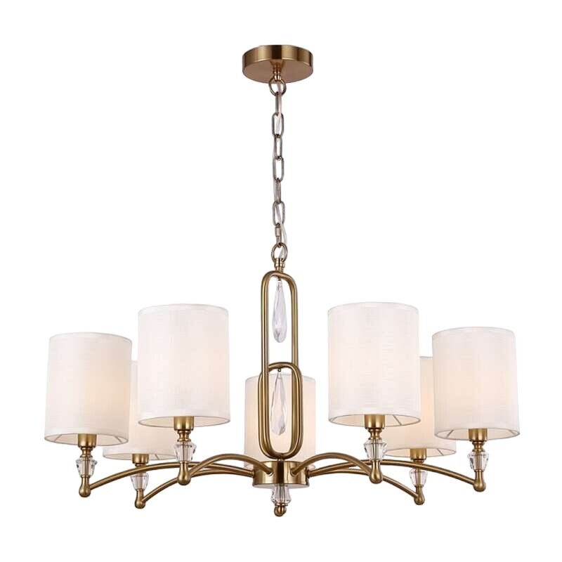 Предназначена для освещения внутренних помещений. Облегченная конструкция в форме арки без традиционного центрального стержня. Металлическая арматура в цвете латунь. Тканевые матовые абажуры белоснежного оттенка завершают цельный образ и служат естественным рассеивателем для источников света. Используйте светильник в гостиных, спальнях, столовых и прихожих, выполненных в стиле неоклассика, классика, ар-деко, модерн. Широкая линейка предлагает различные типы светильников для комплексной зональной и основной подсветки — подвесные люстры на 12, 8, 7 и 5 плафонов, бра, настольную лампу и торшер.