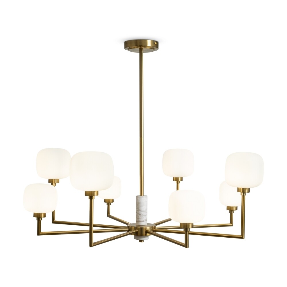 Светильник имеет металлическую графичную арматуру цвета латунь. Плафоны из белого матового стекла в необычной форме округлых кубов закреплены на разной по высоте комбинации. Светильник мягко и равномерно освещает помещение. Источником света служит лампа с цоколем G9.