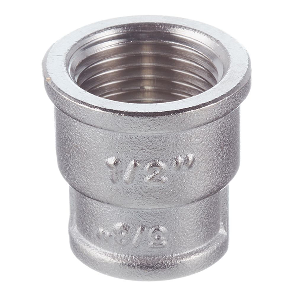 Материал — никелированная латунь. Резьба – внутренняя/внутренняя, цилиндрическая трубная по ГОСТу 6357 (ISO 228, EN 10226), совместима также с наружной конической трубной резьбой по ГОСТу 6211 (ISO R7). Размер — 1/2″х3/8″