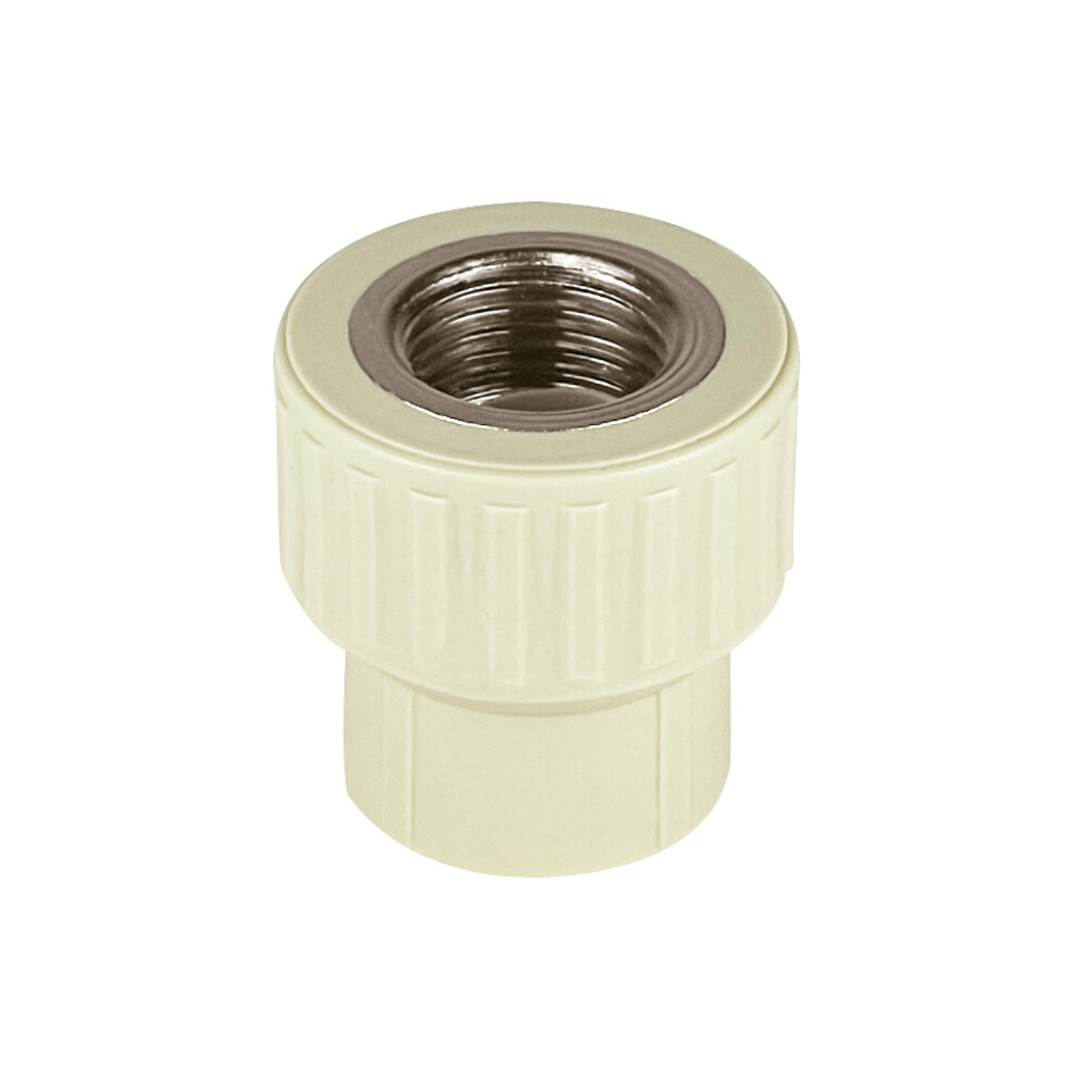 Муфта полипропиленовая, закладная деталь которой изготовлена из латуни марки ЛС-59-1. Используется для соединения полипропиленовой трубы и элемента системы с резьбовым соединением. Латунные части производятся методом горячего штампования, пластиковые — методом литья под давлением.