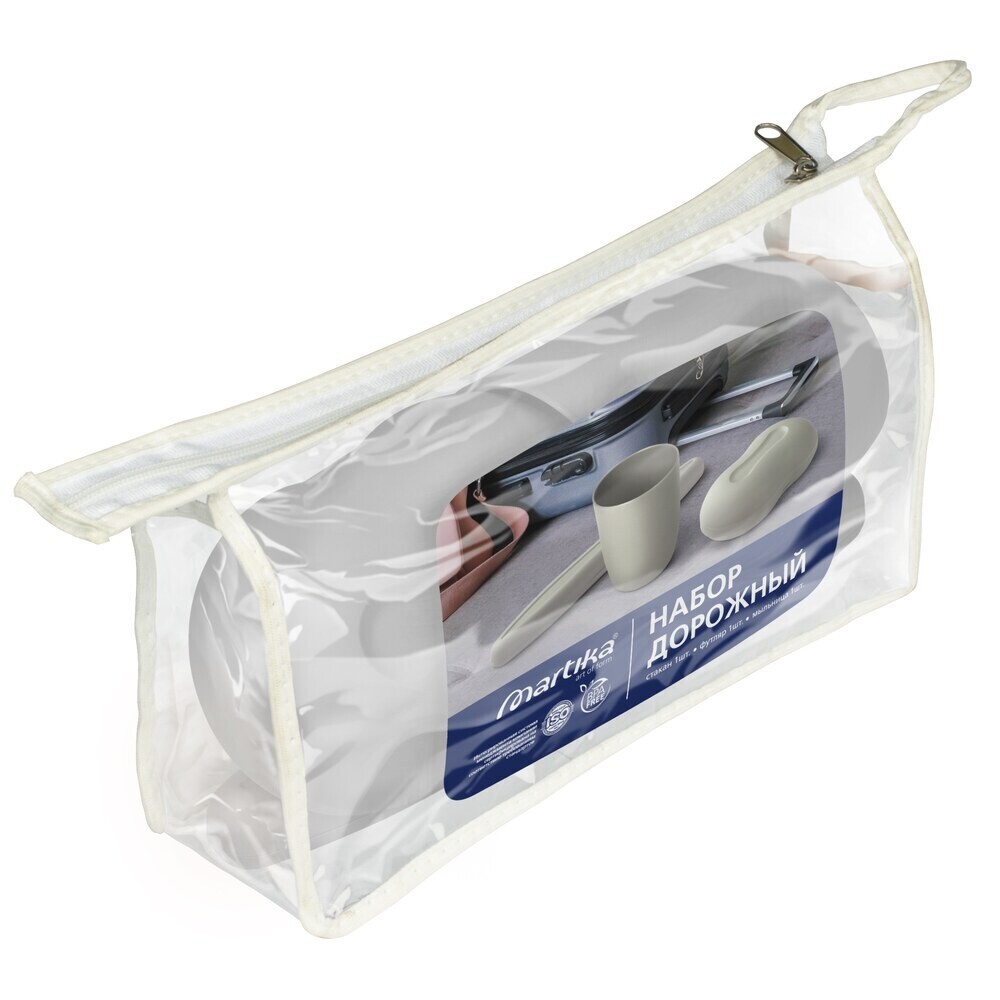 Дорожный набор содержит самые необходимые аксессуары для личной гигиены, который удобно взять в поездку — герметично закрывающаяся мыльница, универсальный футляр для зубной щетки, непрозрачный пластиковый стаканчик. Набор упакован в прозрачную косметичку с замком, что позволяет перевозить предметы гигиены, не опасаясь попадания загрязнений от мыла и зубной пасты на прочие предметы багажа.