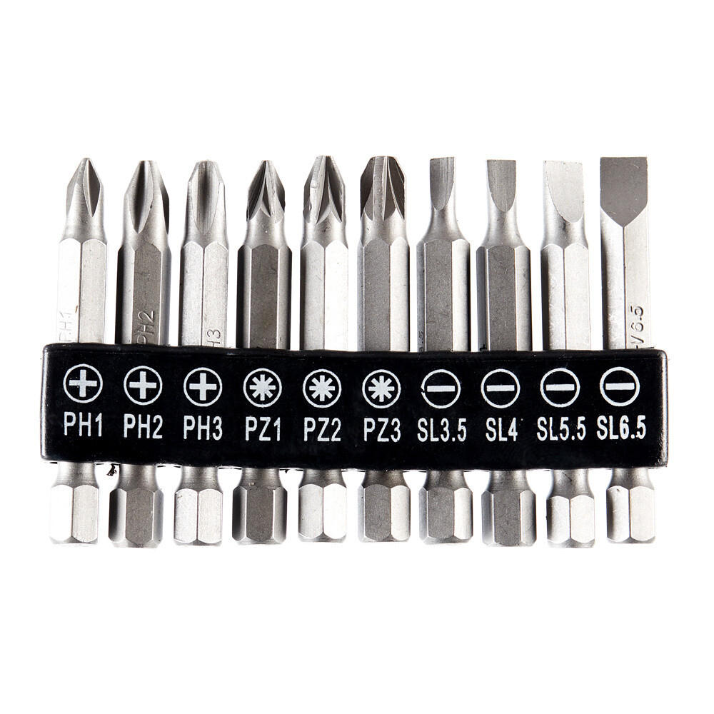 Комплектация: Шлицевые биты SL3.5, SL4, SL5.5, SL6.5 — 4 шт., крестообразные биты PH1, PH2, PH3, PZ1, PZ2, PZ3 — 6 шт.