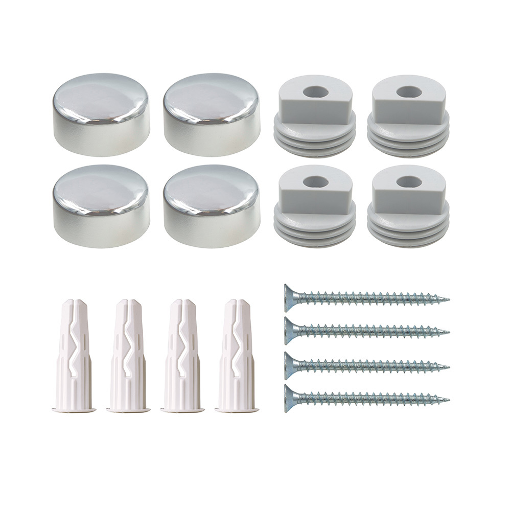 Состав набора: Дюбель 6×25 мм нейлон — 4 шт. Шуруп 3,5×30 мм оцинкованная сталь — 4 шт., Втулка АВС пластик — 4 шт., Декоративный колпачок d 18 мм, цвет хром, материал АВС пластик — 4 шт.