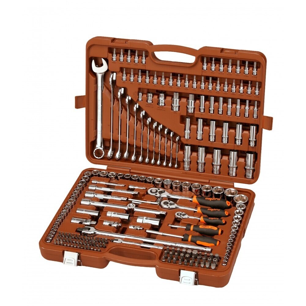 Универсальный набор инструмента, комплектация которого рассчитана на производство работ по техническому обслуживанию автомобильной техники в условиях ремонтных мастерских. Инструменты, входящие в состав набора, позволяют обслуживать крепежные детали метрических и дюймовых размеров. Ассортимент дополнен накидными ключами и головками для механизированного инструмента распространенных размеров.