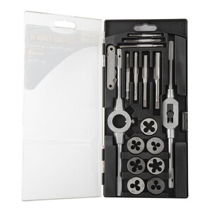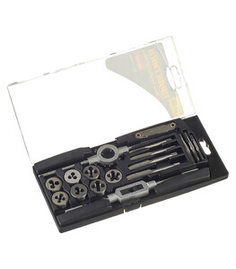 Комплектация: Плашки и метчики: М3,0х0,5 мм, М4,0х0,7 мм, М5,0х0,8 мм, М6,0х1,0 мм, М8,0х1,25 мм, М10,0х1,5 мм, М12,0х1,75 мм, плашкодержатель, метчикодержатель, резьбомер.