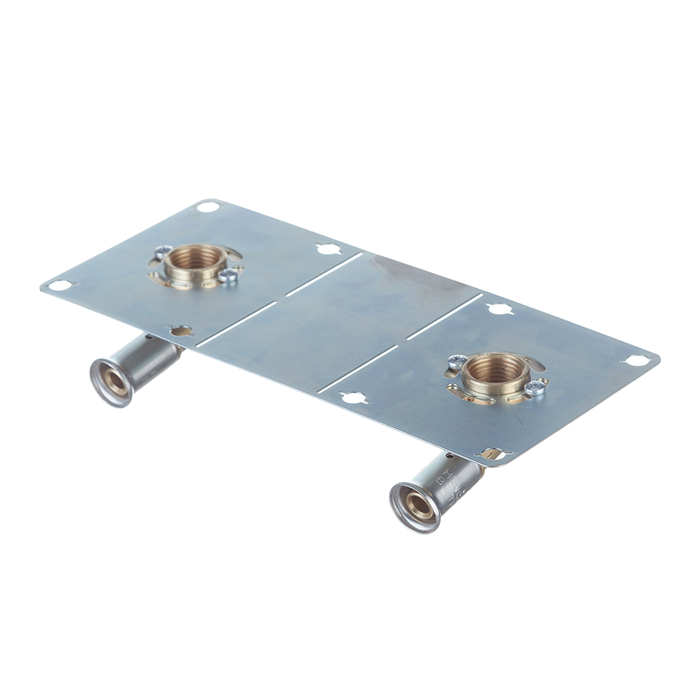 Предназначен для подключения смесителей со стандартным межосевым расстоянием к металлопластиковым трубам диаметром 16 мм способом опрессовки. Устанавливается на гипсокартонный лист и другие аналогичные материалы. Выходное соединение (в месте подсоединения к прибору) 1/2″ с внутренней резьбой.