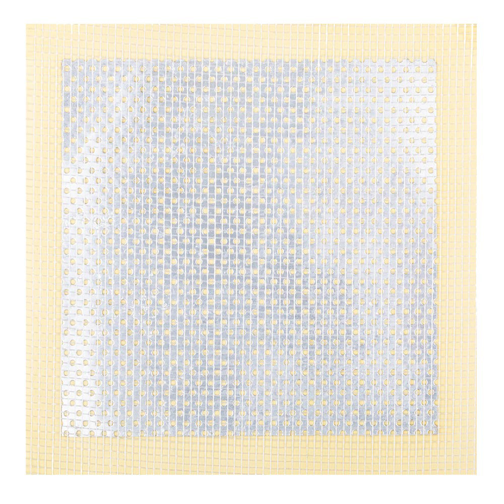 Накладка изготовлена из щелочестойкого стекловолокна на клейкой основе с защитной бумагой и усилена алюминиевой пластиной с перфорацией для более надежного крепления.