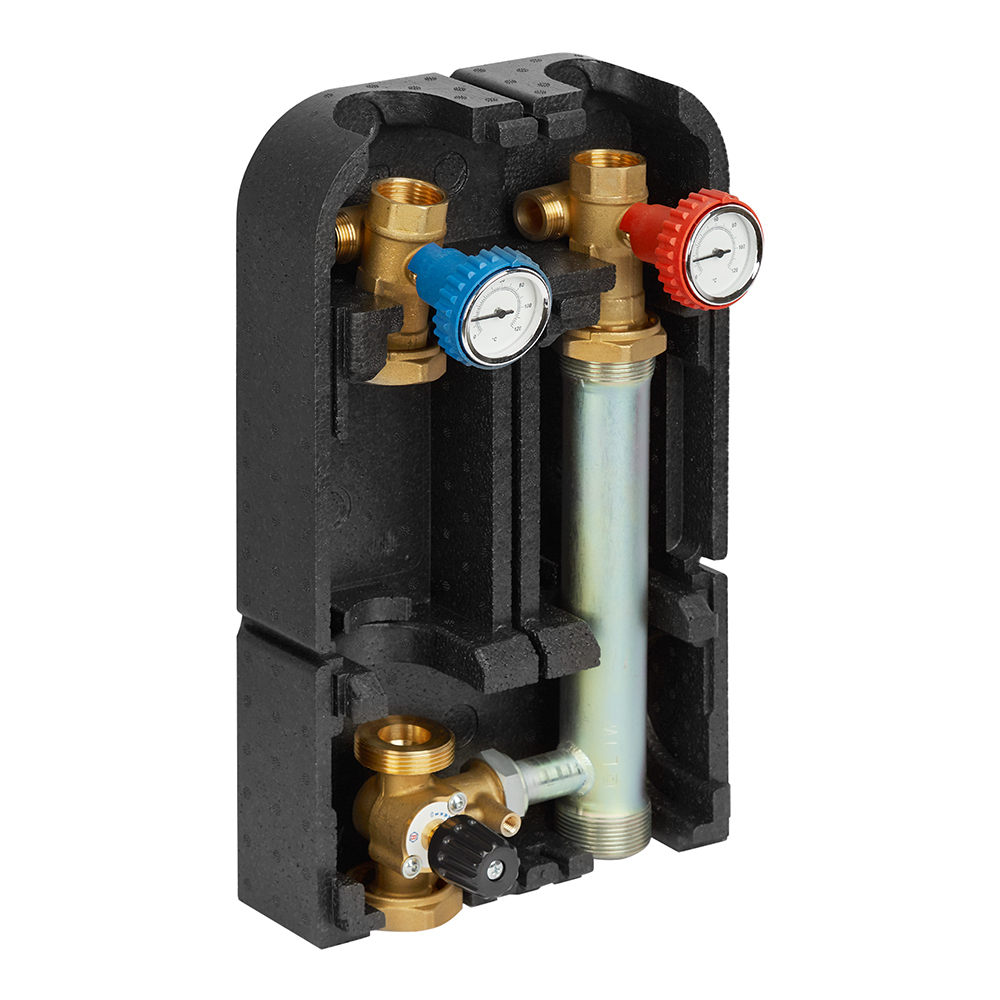 Насосная группа с термостатическим смесительным клапаном, за счет которого осуществляется поддержанием постоянной температуры (точки фиксации) состоит из двух запорных шаровых кранов и одного обратного клапана, двух термометров подающей и обратной линии, смесительного клапана под привод, байпаса и блочной теплоизоляции.