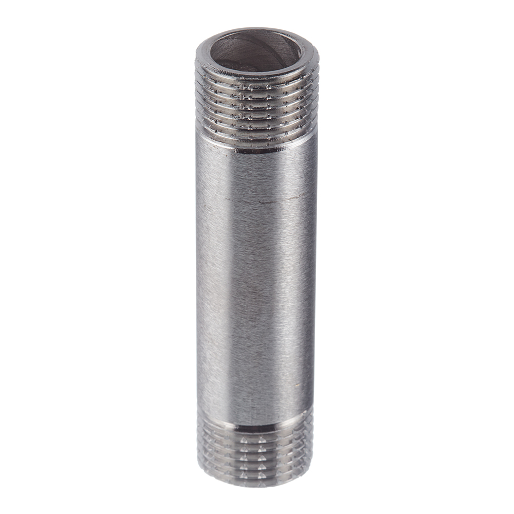 Резьба двухсторонняя наружная трубная цилиндрическая по ГОСТу 6357 (ISO 228, EN 10226). Длина 80 мм, диаметр – 1/2″. Материал — никелированная латунь.