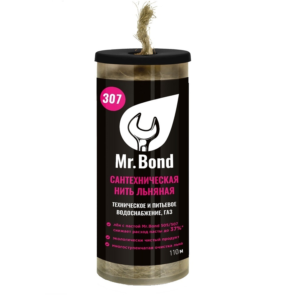 Нить льняная сантехническая Mr.Bond 307 представляет собой чистый натуральный продукт, изготовленный из тонкого, однородного, длинноволокнистого, чесаного льна, получаемого из стебля льна. Изготовлен по ГОСТ Р 53549-2009. Лен является органическим материалом, подверженным гниению при контакте с влагой и воздухом, поэтому его следует пропитывать специальными средствами. Тонко-чесанный сантехнический лен вместе с уплотняющими пастами Mr.Bond 505/507, используются для уплотнения резьбовых соединений в трубопроводах различного назначения. Сантехнический лен является 100% натуральным продуктом, поэтому в процессе эксплуатации не выделяет токсичных и вредных веществ. Лен сантехнический применяется в сантехническом производстве — набивка сальниковых муфт, уплотнение чугунных и керамических труб с раструбом, подходит для любого вида соединений.