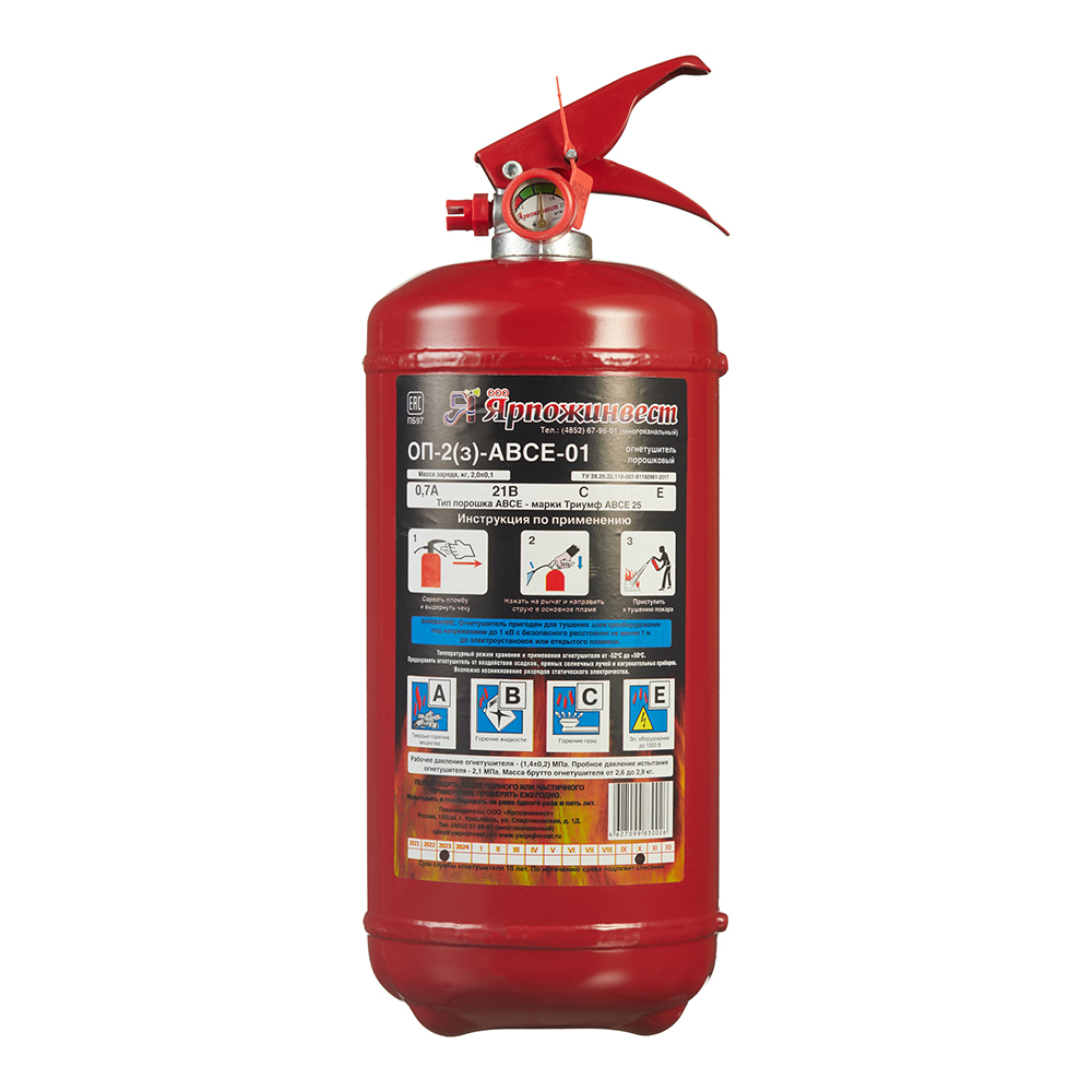Изготавливается в соответствии с ГОСТ Р 51057-2001. Огнетушитель порошковый ОП-2 АВСЕ предназначен для защиты помещений производственного и хозяйственного назначения, применения на автомобильном, железнодорожном, речном транспорте, морских судах и в бытовых условиях в качестве первичных средств тушения.