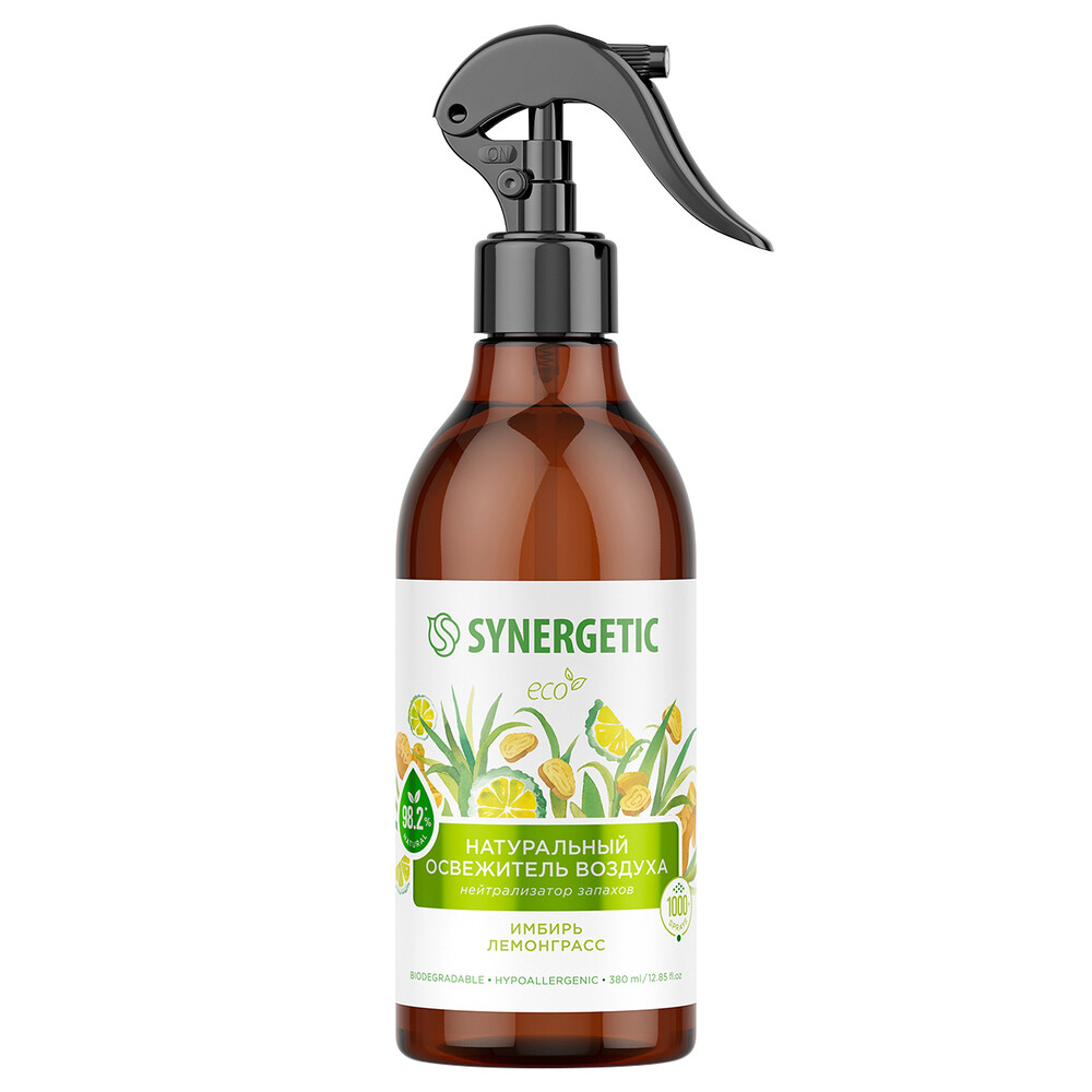 Биоразлагаемый освежитель воздуха, нейтрализатор запахов Synergetic «Имбирь и лемонграсс» на водной основе — это безопасная формула с высокой концентрацией натуральных компонентов. Парфюмерная композиция с эфирными маслами имбиря, бергамота и лемонграсса наполняет воздух ярким цитрусовым ароматом. Гипоаллергенная формула безопасна для людей и животных. Благодаря натуральному поглотителю запахов — соли полиитаконовой кислоты — освежитель эффективно устраняет, а не маскирует стойкие запахи от приготовления пищи, домашних животных, табака и других источников неприятных запахов в гостиной, ванной комнате и санузле, спальне, коридоре, кухне, автомобиле, офисе и прочих помещениях. Подходит для устранения неприятных запахов с тканей (диванов, подушек, ковров, занавесок, простыней, тканевых автокресел, постельного белья), занавесок для душа и спортивных ковриков. Не оставляет следов на поверхностях.