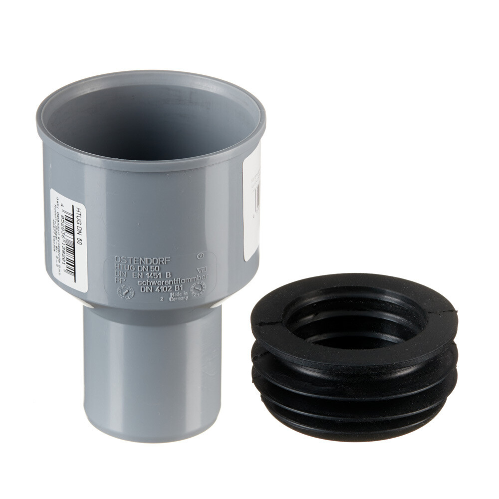 Внутренняя система канализации Ostendorf HT. Предназначен для перехода с гладкой части чугунной трубы с условным диаметром DN 50 мм или фитинга на раструб трубы или фитинга из полипропилена.