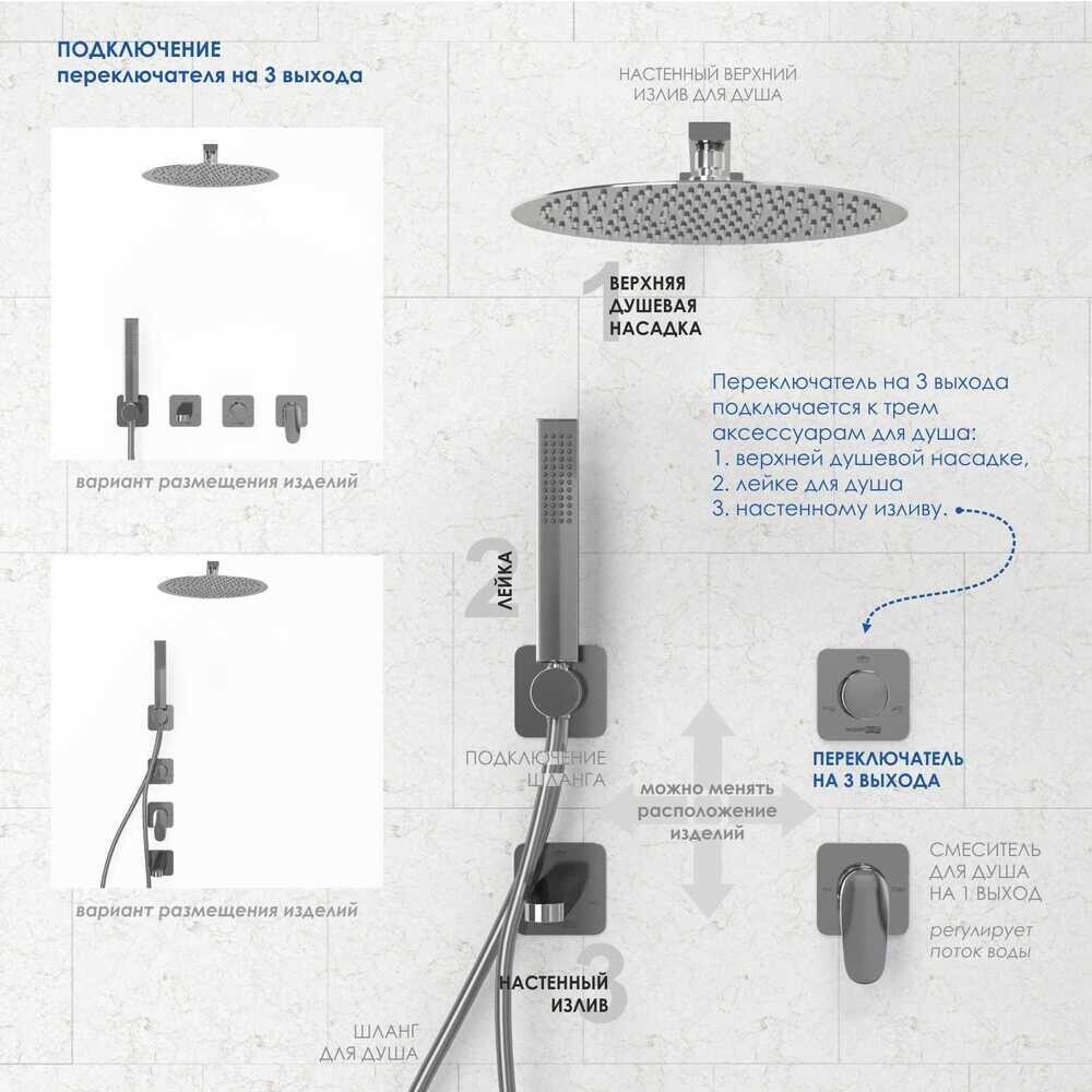 Переключатель потоков Fulda 5200. Для создания покрытия Soft-touch матового черного или белого цвета изделия проходят процесс гальванизации. Особый цвет и ощутимая мягкость получаются с помощью нанесения электролитов, в состав которых входит никель. Такое покрытие отличается прочностью, оно легко очищается и, главная его особенность, покрытие бархатистое на ощупь. Переключатель на 3 выхода. Подключается к трем аксессуарам для душа: верхней душевой насадке, лейке для душа и настенному изливу, в зависимости от ваших предпочтений.