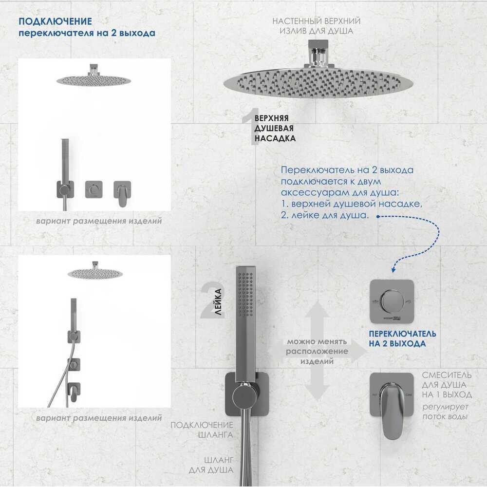 Смесители проходят процесс многослойного нанесения на корпус изделия хрома и никеля. Такое покрытие устойчиво к потускнению, легко очищается и придает изделиям зеркальный блеск и серебристый цвет. Переключатель на 2 выхода. Подключается к двум аксессуарам для душа на выбор: верхней душевой насадке, лейке для душа и настенному изливу, в зависимости от ваших предпочтений.