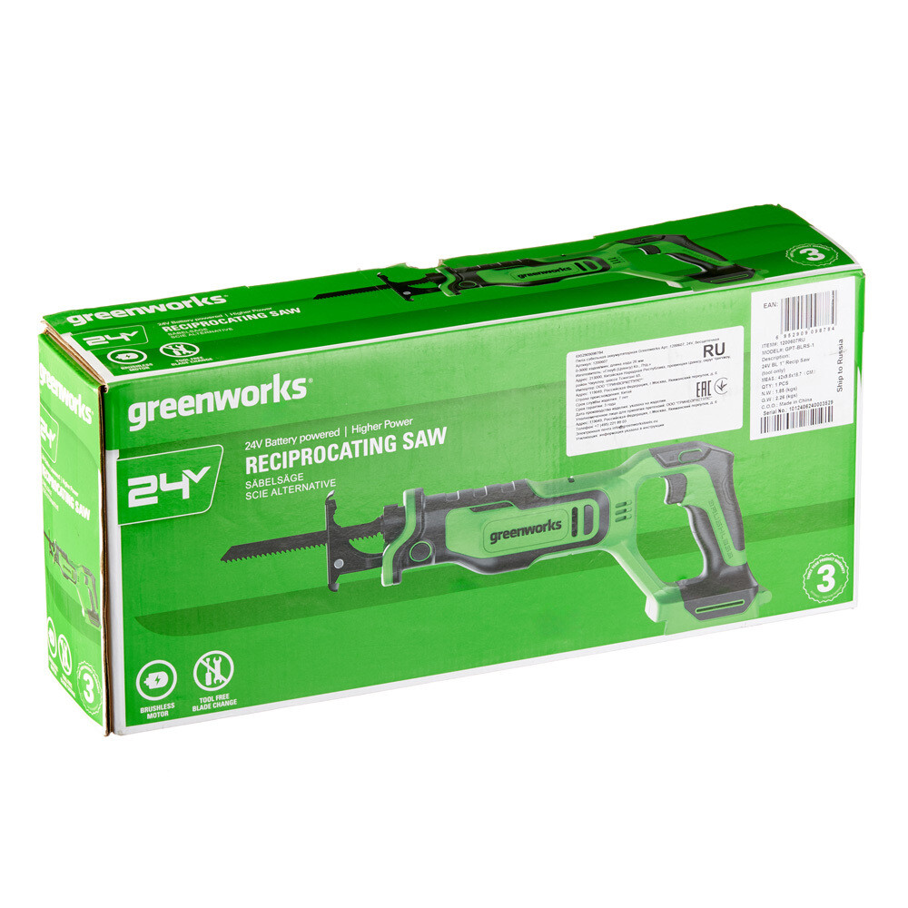 Пила сабельная аккумуляторная Greenworks GPT-BLRS-1 24 В без АКБ и ЗУ (1200607)