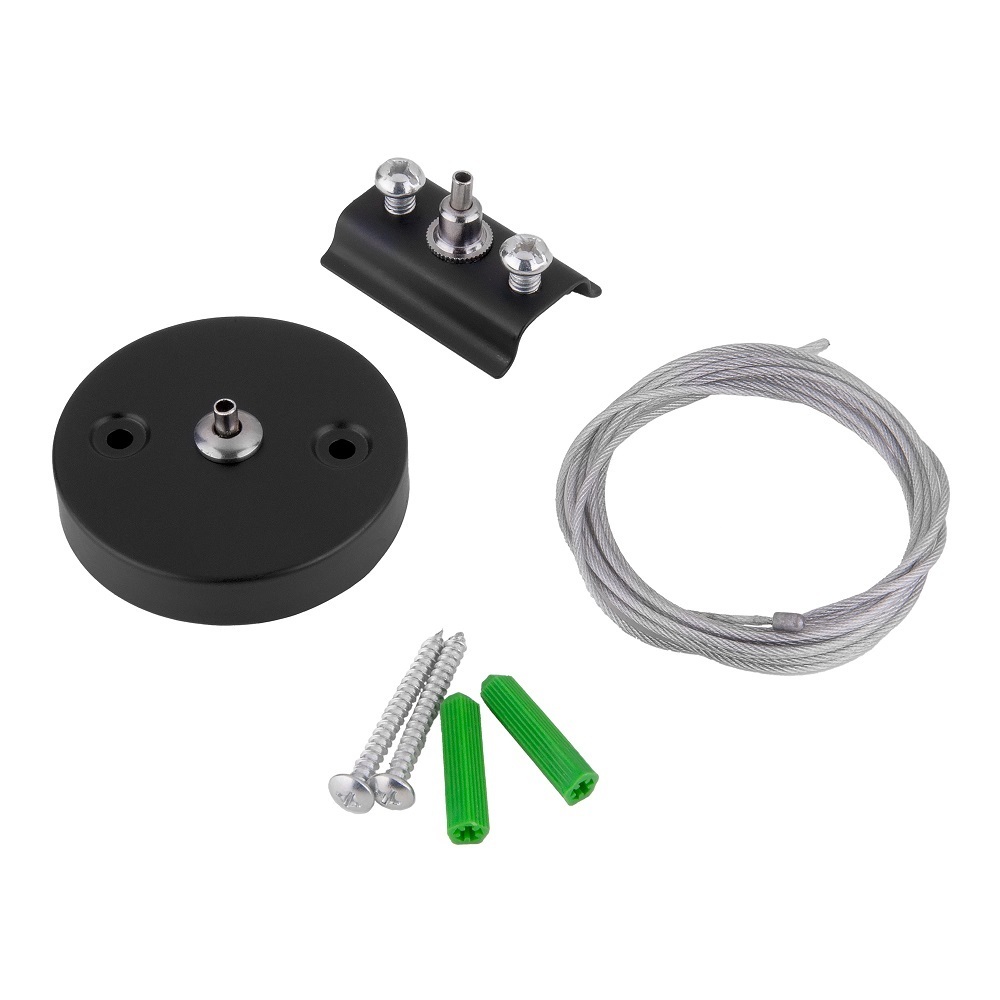 Комплектация: прочный двухметровый трос, металлическая потолочная чаша, крепление к шинопроводу, комплект крепления к потолку.