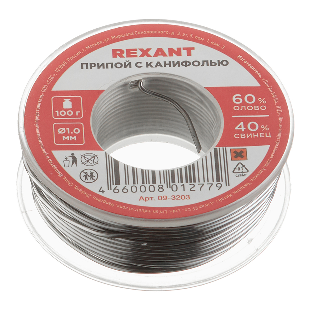 Припой Rexant d1 мм Sn60 Pb40 Flux 2.2 % с канифолью 100 г (09-3203)