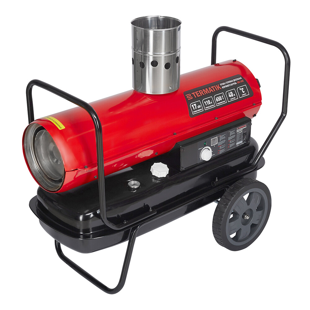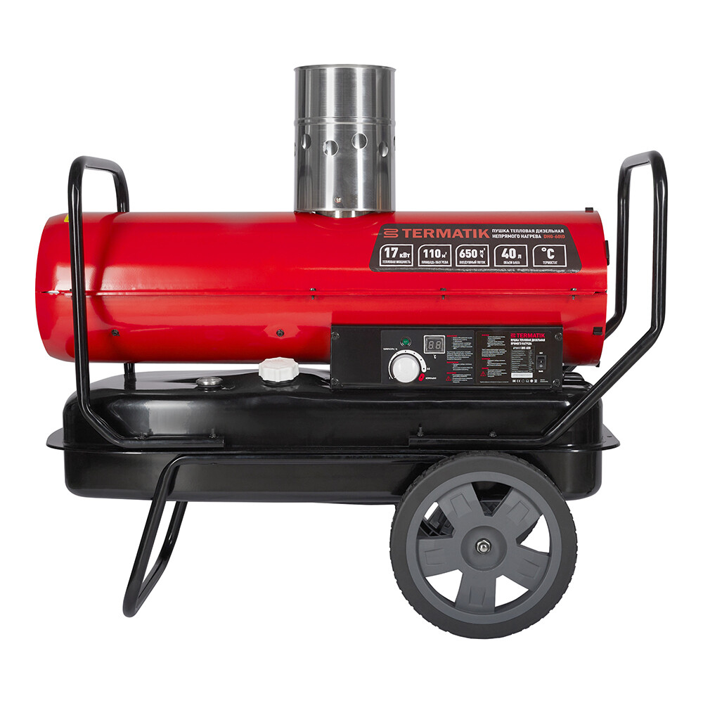 Тепловая дизельная пушка Termatik DHG-60ID предназначена для обогрева и просушки воздуха или поверхностей на крупных строительных объектах, складских помещений, цехов и других помещений площадью до 110 м², в условиях, исключающих попадание на него капель, брызг, а также атмосферных осадков. Данная тепловая пушка непрямого нагрева работает на дизельном топливе и предназначена только для промышленного использования. Продукты горения, при установленном дымоходе, не поступают в отапливаемое помещение. Использовать только в хорошо вентилируемых помещениях. Пушка оснащена термостатом для работы в автономном режиме с поддержанием заданной температуры. На корпусе тепловой пушки находится регулятор термостата и цифровое табло температуры. Пушка имеет защиту от перегрева, систему контроля пламени и систему электрозащиты. Подключение прибора – сете…