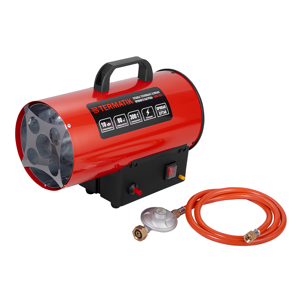 Тепловая газовая пушка Termatik GHG-101 предназначена для обогрева и просушки воздуха или поверхностей на крупных строительных объектах, складских помещений, цехов и других помещений площадью до 80 м2, в условиях, исключающих попадание на него капель, брызг, а также атмосферных осадков. Данная тепловая пушка прямого нагрева работает на сжиженном газовом топливе и предназначена только для промышленного использования. Пушка оснащена защитой от перегрева, системой контроля пламени и системой контроля подачи газа. Подключение прибора – сетевой кабель с вилкой в комплекте. Данная модель рассчитана на питание от электросети переменного тока напряжением 220 В и частотой 50 Гц.